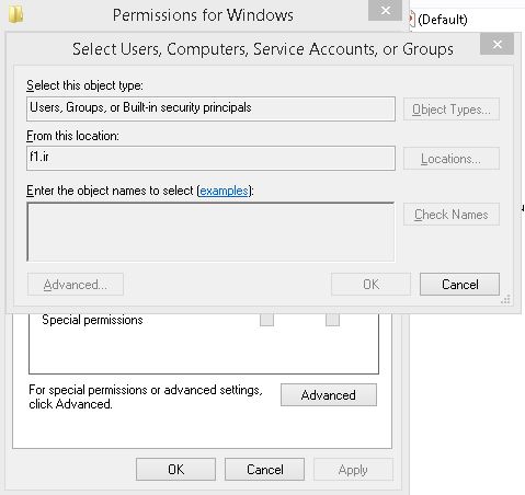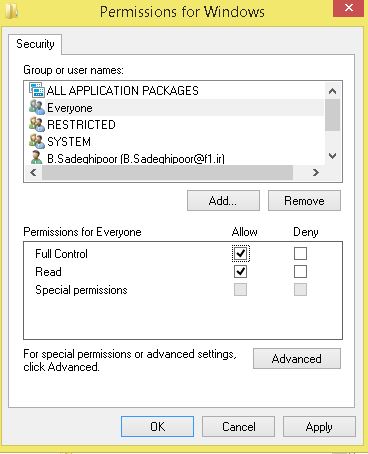 حال روی پوشه ویندوز کلیک راست کرده و گزینه permission را انتخاب می کنیم و از داخل کادر گزینه add و سپس advanced و سپس find now را می زنیم و everyone را انتخاب می کنیم تا به لیست اضافه شود .سپس permission آن را از نوع full control انتخاب می کنیم .
