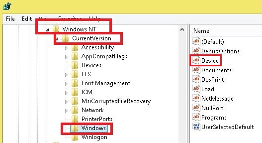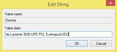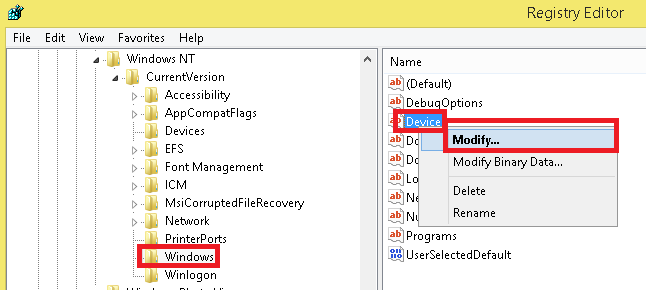 سپس از سمت راست گزینه device را انتخاب می کنیم و روی device کلیک راست می کنیم و گزینه modify را انتخاب می کنیم و در قسمت value data قبل از عبارت ,winspool,UDC هر چه نوشته پاک می کنیم و نام پرینتر پیش فرض را که کپی کرده بودیم را در اینجا وارد می کنیم.