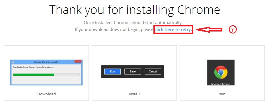توجه داشته باشید، چنانچه نصب کننده گوگل کروم به صورت خودکار شروع به دانلود نکرد با کلیک بر روی عبارت Click here to retry ، دانلود بعد از چند ثانیه شروع خواهد شد.