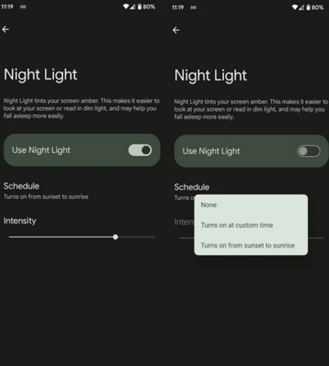تنظیم و زمان‌بندی فیلتر نور آبی در اندروید بسیار ساده است. در بیشتر گوشی‌ها، کافی است به تنظیمات بروید، سپس گزینه نمایشگر را انتخاب کنید و به دنبال نور شب بگردید. شما می‌توانید این فیلتر را به‌صورت خودکار فعال کنید و شدت افکت آن را تنظیم نمایید. برای داشتن کنترل دقیق‌تر، نیاز به نصب یک برنامه خواهید داشت.