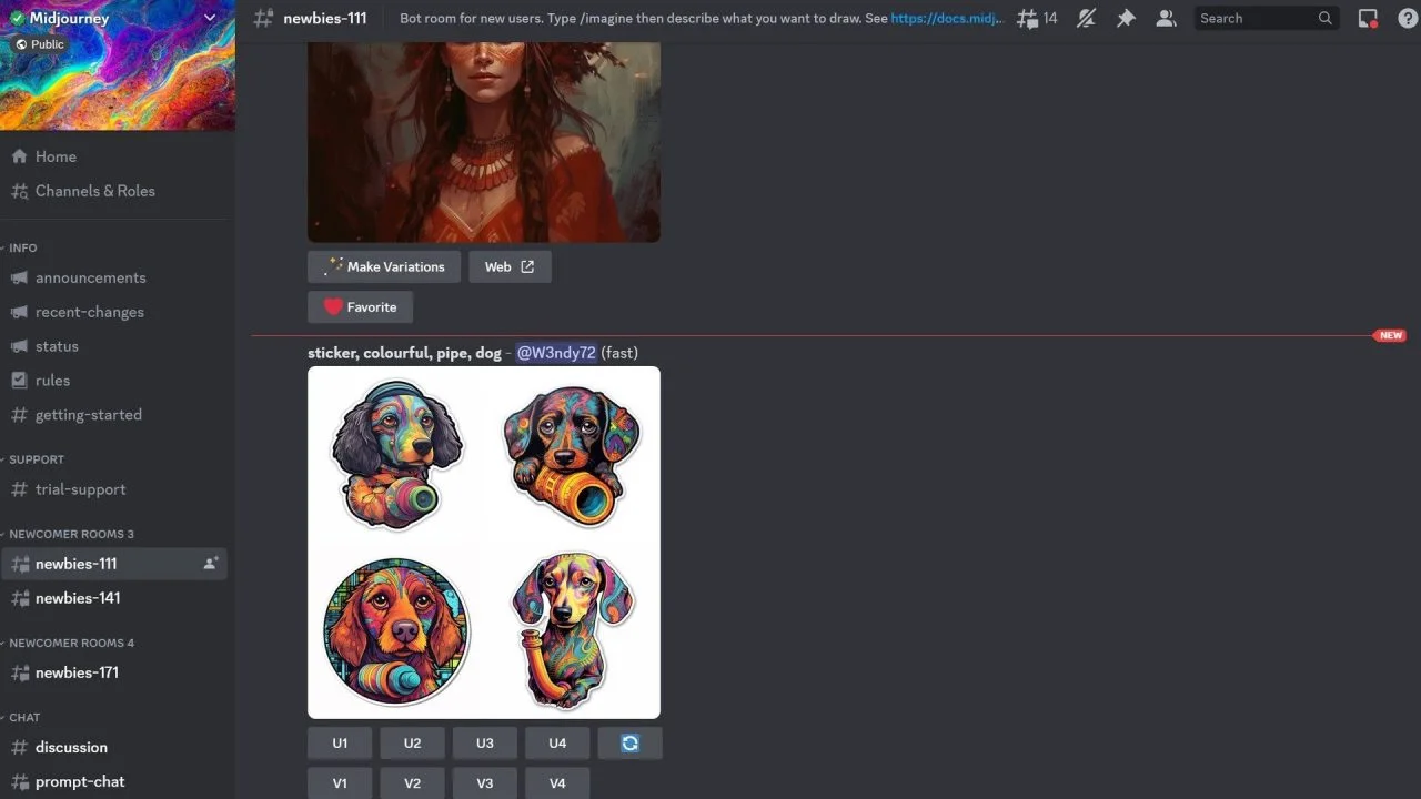 در جعبه متن دستور خود را با نوشتن "/imagine" شروع کنید و ادامه توضیحات خود را اضافه کنید. پس از ارسال دستور، تصاویر مورد نظر شما ساخته می‌شوند و گزینه‌هایی برای تعامل با تصویر به شما نمایش داده می‌شود.