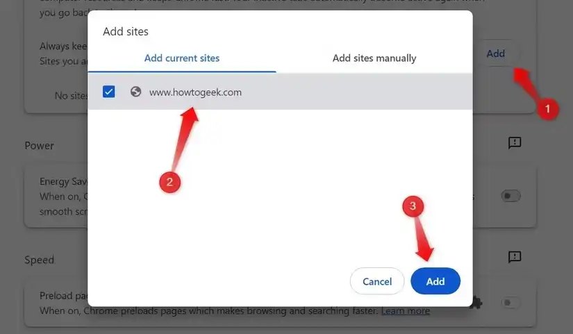 اگر میخواهید ویژگی ذخیرهسازی حافظه فعال بماند اما برخی وبسایتها از این قانون مستثنی شوند، میتوانید آنها را بهصورت دستی اضافه کنید. برای این کار، روی دکمه Add در کنار گزینه Always Keep These Sites Active کلیک کنید. سپس وبسایت مورد نظر را از لیست انتخاب کرده یا URL آن را وارد کنید و در نهایت Add را بزنید.