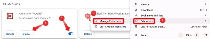 اگر افزونههایی برای رفرش خودکار صفحات نصب کردهاید، ممکن است این افزونهها با عملکرد سایر صفحات تداخل داشته باشند. به همین دلیل، باید این افزونهها را موقتاً غیرفعال کنید. برای این کار، روی سه نقطه عمودی در گوشه بالا سمت راست کلیک کرده و به مسیر Extensions > Manage Extensions بروید. سپس دکمه کشویی کنار افزونه مورد نظر را غیرفعال کنید.