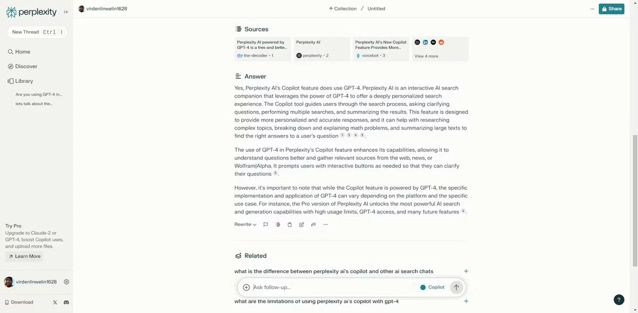 Perplexity.ai یک ابزار هوش مصنوعی است که امکان استفاده رایگان از GPT-4 را فراهم می‌کند. در نسخه رایگان، می‌توانید هر ۴ ساعت، ۵ سؤال مطرح کنید. این ابزار بیشتر برای جستجوی اینترنتی طراحی شده و گزینه‌ای مناسب برای جستجوهای سریع محسوب می‌شود.