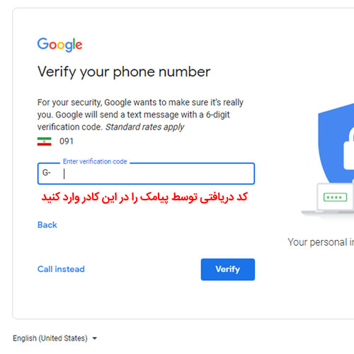 6. کد ارسالی برای شماره موبایل را وارد کنید. از نکات مهمی که در آموزش ساخت جیمیل باید به آن اشاره کنیم فرآیند تایید دو مرحله ای است. این فرآیند به منظور امنیت هرچه بیشتر حساب کاربری شما اجرا می شود. در این روش احراز هویت، شما برای ورود به جیمیل از طریق کامپیوتر، باید یک کد را بر روی صفحه ی گوشی خود تایید کنید؛ با این روش کار هکرها برای دسترسی به حساب شما تا حد بسیار زیادی سخت خواهد شد.