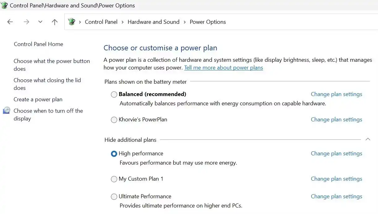 ۳. حالت High Performance را فعال کنید و در صورت نیاز از گزینه Change plan settings برای شخصیسازی تنظیمات استفاده کنید.