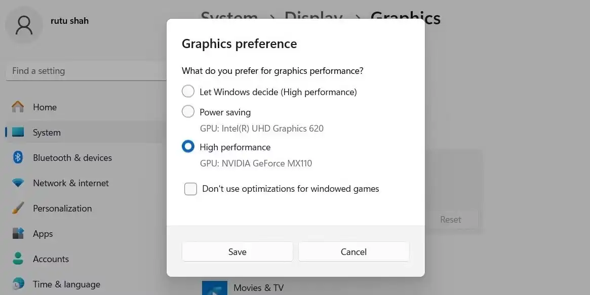 5. فعالسازی استفاده از پردازنده گرافیکی مجزا برای برنامهها