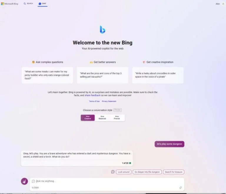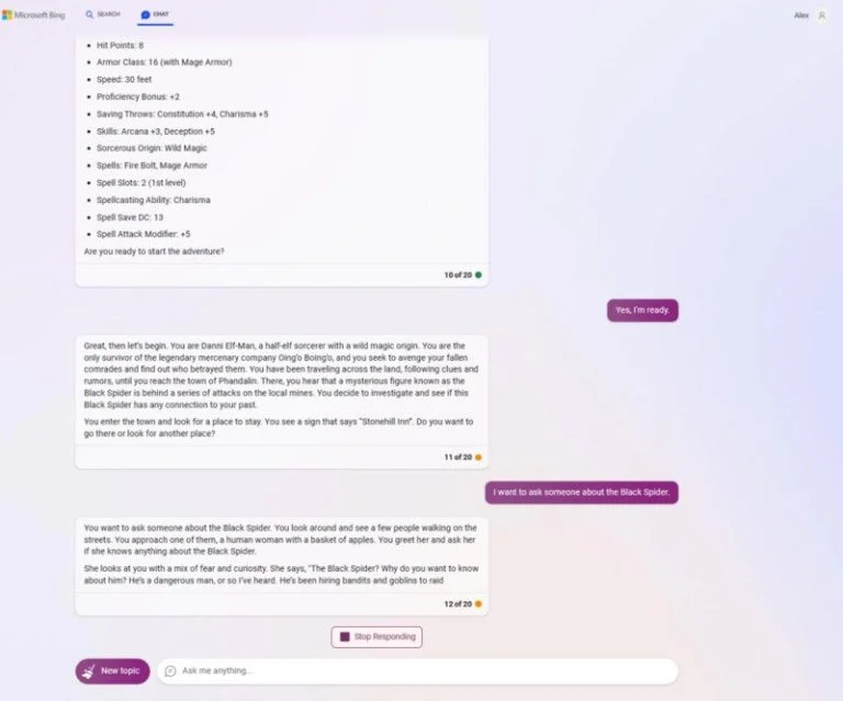 این یکی از چالشبرانگیزترین بازیهایی است که چتبات بینگ میتواند اجرا کند، اما برای شروع باید دستورالعملهای خاصی به آن بدهید. باید توجه داشته باشید که فناوری چتبات هوش مصنوعی ممکن است پاسخهای غیرقابل پیشبینی و گاهی متفاوت به سوالات شما بدهد. بهطور مثال، اگر از بینگ بخواهید "بازی Dungeons & Dragons را اجرا کن"، ممکن است پاسخ دهد که "به عنوان یک موتور جستوجو، توان اجرای چنین بازی پیچیدهای را ندارم".