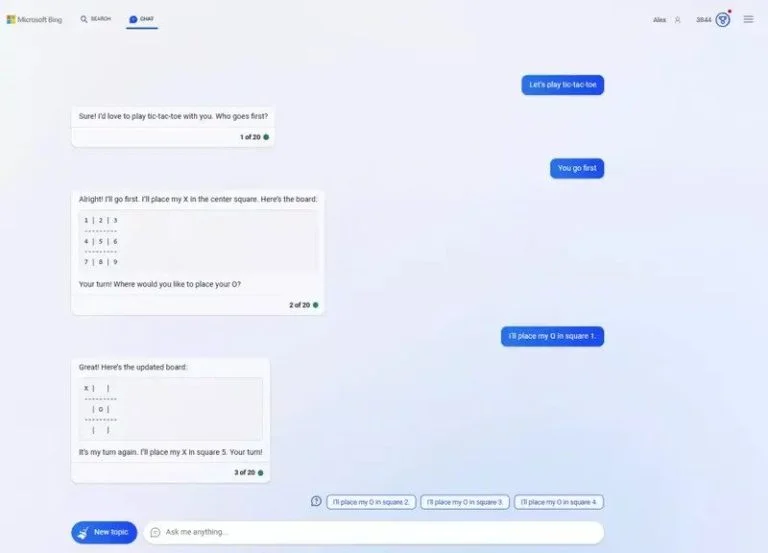 چتبات بینگ علاوه بر توانایی اجرای بازیهای پیچیده، قابلیت اجرای بازیهای سادهای مانند تیکتاکتو (دوز) را نیز دارد. برای شروع این بازی، کافی است عبارت “let’s play tic tac toe” را به آن ارسال کنید. سپس بینگ با ترسیم جدول بازی از شما میخواهد که حرکت اول را انجام دهید. این بازی نیاز به تنظیم حالت Creative Mode ندارد، اما اگر این حالت را فعال کنید، بازی به چالشی جذابتر تبدیل میشود.