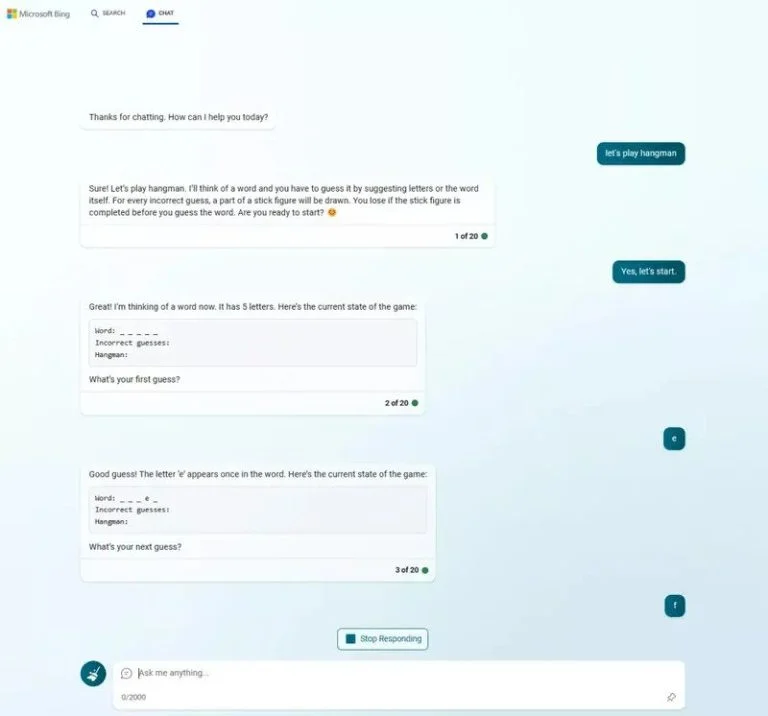 بازی حدس کلمات یا همان هنگمن یکی دیگر از بازیهای سادهای است که چتبات بینگ میتواند اجرا کند. برای شروع بازی، کافی است عبارت "let’s play hangman" را تایپ کنید. گاهی اوقات بینگ از شما میخواهد که تعداد حروف کلمه مورد نظر را مشخص کنید و گاهی اوقات خود بهطور خودکار تعداد حروف را تعیین میکند.