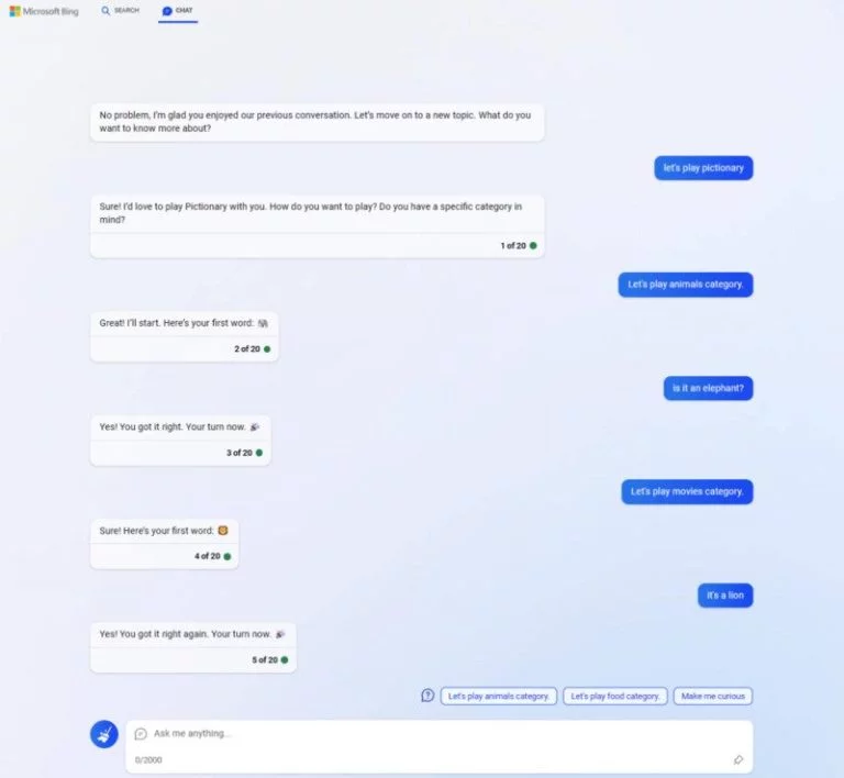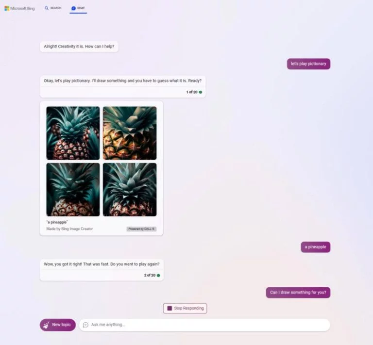 در حالت عادی، پس از دریافت درخواست "let’s play pictionary" از ایموجیها برای بازی استفاده میکند. اما در حالت Creative Mode، با استفاده از فناوری Dall-E تصاویری تولید کرده و از شما میخواهد که نام آنها را حدس بزنید.