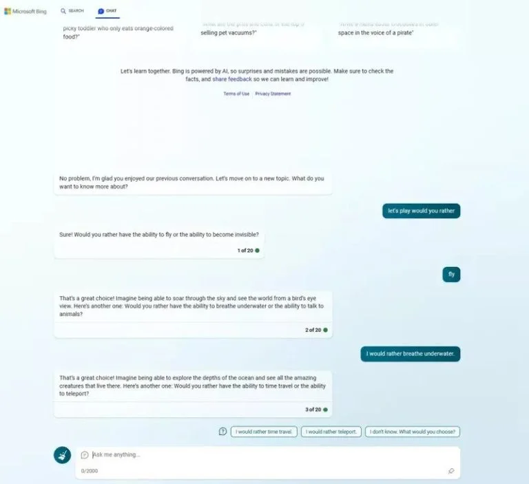 "Would You Rather" یکی از بازیهای قدیمی است که در آن سوالاتی مانند "ترجیح میدهید که بتوانید نامرئی شوید یا پرواز کنید؟" از شما پرسیده میشود. برای شروع بازی در بینگ کافیست درخواست "let’s play would you rather" را ارسال کنید. چت بات بینگ به دلیل ویژگی غیرقابل پیشبینی بودن خود، به یک موتور جستوجوی قابل اعتماد تبدیل نمیشود، اما این ویژگی در حالت Creative Mode جنبههای سرگرمکنندهای را به آن اضافه کرده است. خوشبختانه این چت بات بهطور رایگان در دسترس قرار دارد و شما میتوانید تجربهای جدید از سرگرمی را با آن داشته باشید.