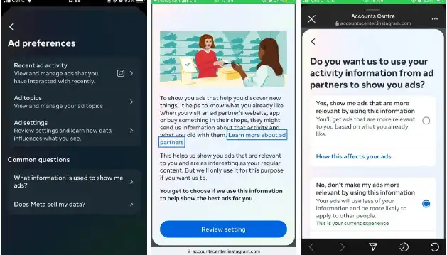 2. در مسیر Accounts Center > Ad preferences > Ad settings > Activity information from ad partners گزینه Review setting را انتخاب کنید.