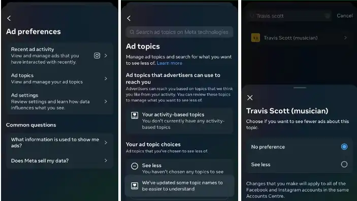 در بخش Accounts Center به مسیر Ad preferences > Ad topics بروید.