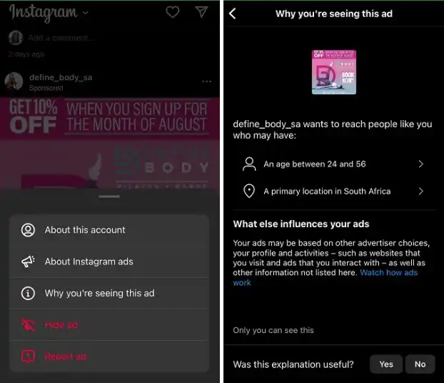 برای بررسی دلیل نمایش تبلیغ خاص، روی آیکون سه نقطه در کنار آن کلیک کرده و گزینهی Why you’re seeing this ad را انتخاب کنید. توضیحات مرتبط در این بخش نمایش داده میشود.