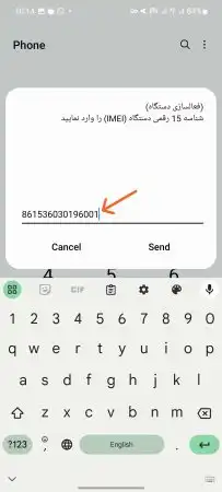 کد IMEI موجود به روی جعبه گوشی را با دقت وارد کرده و Send را بزنید. در نظر داشته باشید که می‌توانید IMEI 1 یا IMEI 2 را انتخاب کنید و تفاوتی در روند ایجاد نمی‌کند.