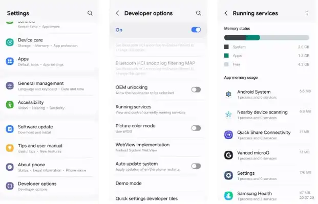 منوی Developer Options در گوشیهای اندروید امکانات مفیدی را در اختیارتان قرار میدهد و شما را از وضعیت عملکرد گوشی مطلع میسازد. یکی از گزینههای مهم این منو، Running services است که لیست برنامههای در حال اجرا را به همراه مقدار مصرف RAM نشان میدهد. برای دسترسی به این منو، مراحل زیر را دنبال کنید: