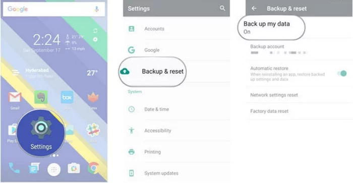 1. در گوشی قدیمی، به تنظیمات رفته و در بخش Backup and Reset گزینه پشتیبانگیری از دادهها را فعال کنید.