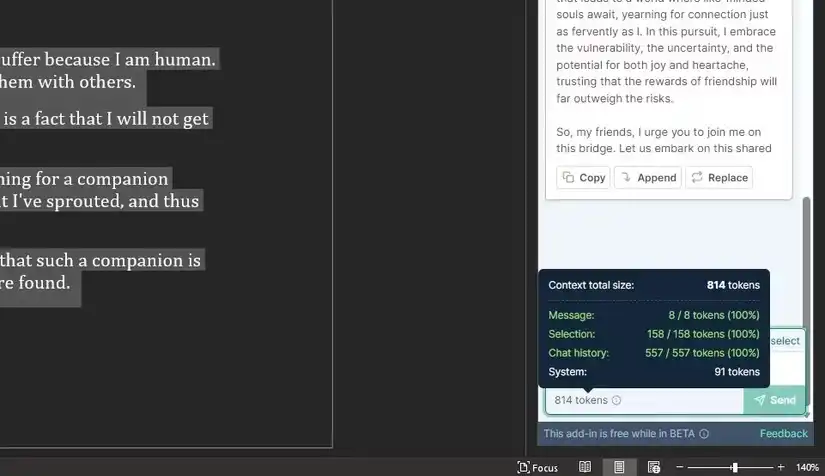 پس از دریافت پاسخ، افزونه به شما این امکان را می‌دهد که پاسخ را در زیر متن انتخابی جاسازی (Embed) کنید یا بخش انتخاب‌شده را با پاسخ ChatGPT جایگزین (Replace) کنید. همچنین در زیر کادر درخواست، تعداد توکن‌های استفاده‌شده نمایش داده می‌شود. از آنجا که ChatGPT از کل مکالمه به‌عنوان زمینه استفاده می‌کند، بهتر است مکالمه‌های قدیمی را بازنشانی کنید تا از حد مجاز توکن فراتر نروید.